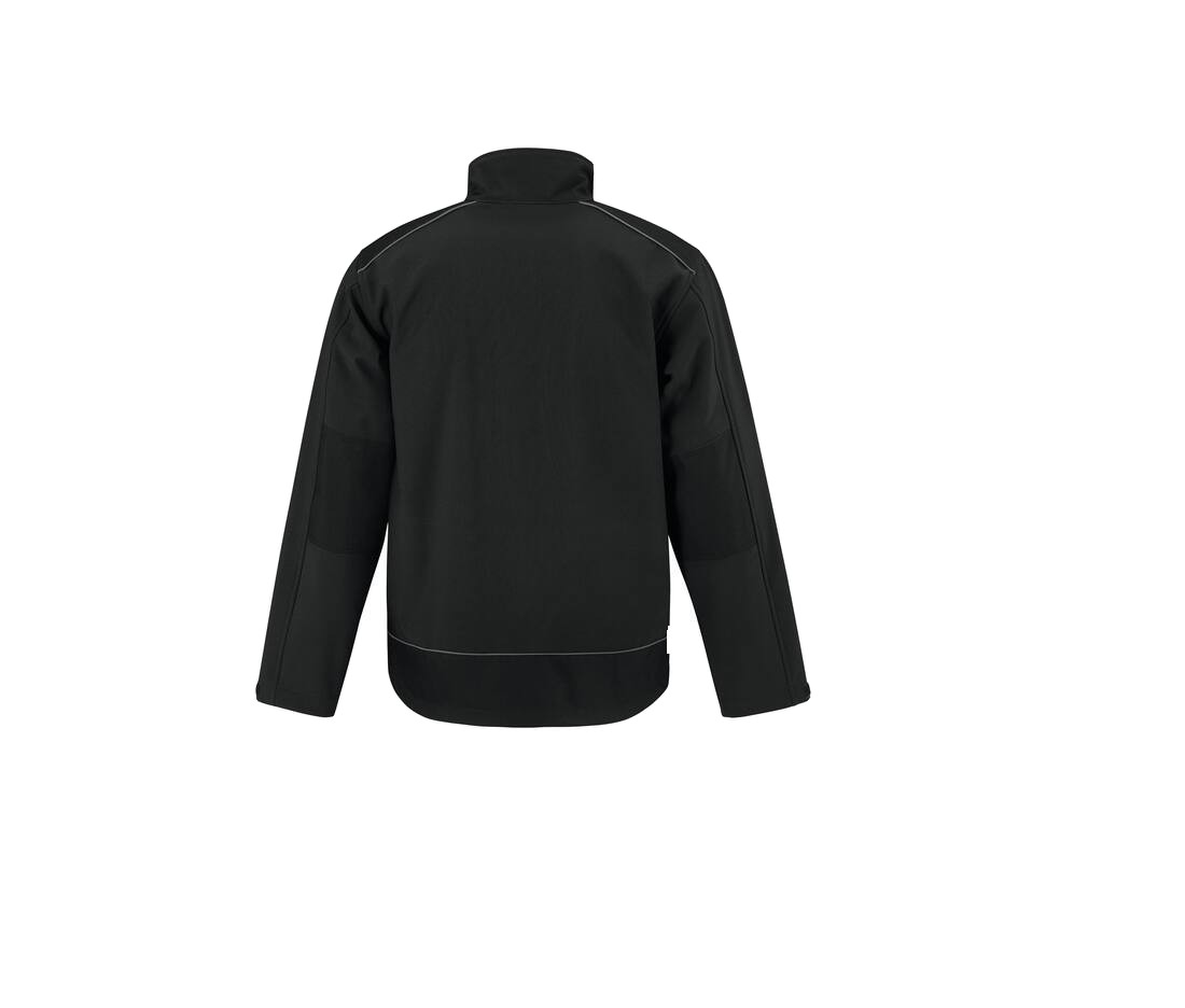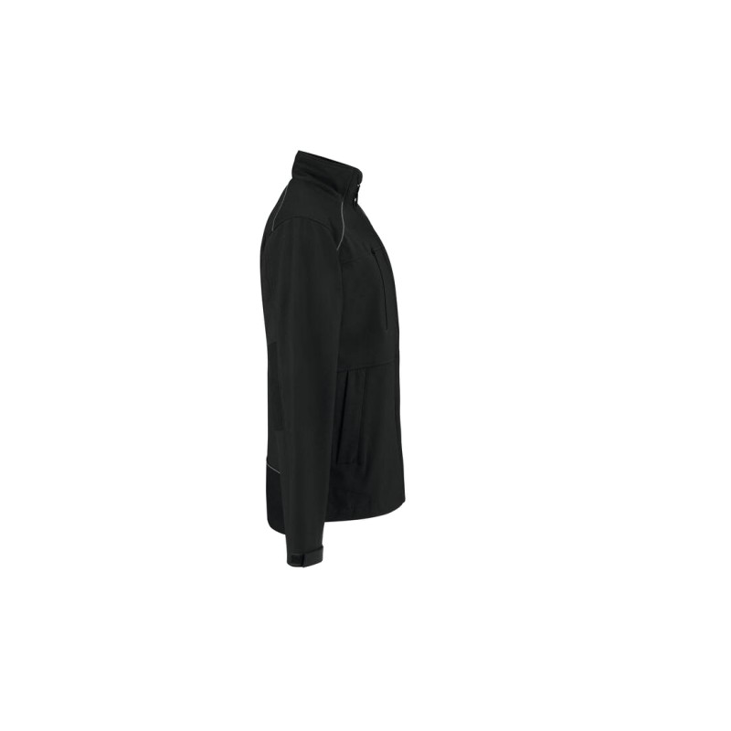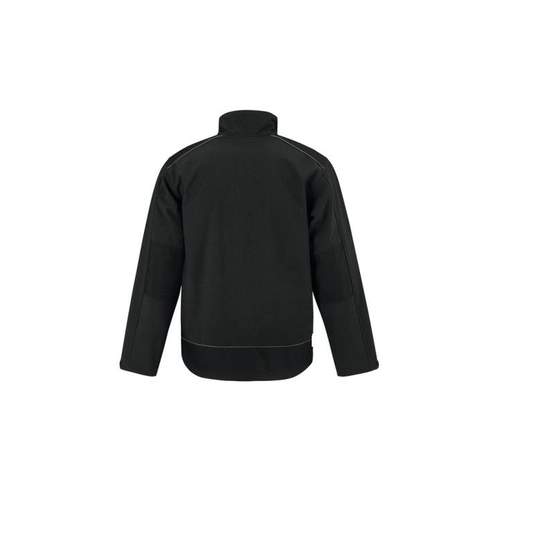Softshell rip-stop 3 couches. Couche extérieure : mini rip-stop 96 % polyester / 4 % élasthanne. Couche intermédiaire : membrane laminée en polyuréthanne thermoplastique respirante (1000g/m²/24h), coupe-vent et imperméable (2000 mm). Couche intérieure : micro-polaire 100 % polyester. Dos plus long, col montant, patte intérieure anti-intempéries et protège-menton. Passepoil réfléchissant sur les épaules et en bas du dos. Pièces de renforcement noires en nylon Oxford sur les épaules, les coudes et le bord inférieur à l'arrière. Coutures à double surpiqûre et zip SBS. Manches articulées et poignets ajustables. 2 poches avant zippées avec rabat, 1 poche poitrine zippée à droite, 2 poches intérieures. Bord inférieur ajustable à l'aide de cordons et de stoppers. Accès facile pour la décoration (avant - arrière - manches).